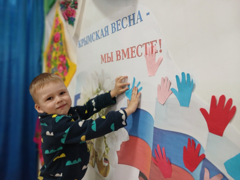 Сегодня в нашем детском саду прошел замечательный день! Наши воспитанники группы "Ромашка"приняли участие в трогательной акции "Мы вместе", посвящённой присоединению Крыма к России. Каждый ребенок обвёл на цветной бумаге и вырезал свою маленькую ладошку и приклеил её на общее панно. Это символ единства, дружбы и поддержки друг друга.